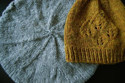 Pattern includes directions for a fitted beanie or beret shape. leaf pattern has both charted and written directions. beret takes 2 skeins of shelter. fitted version uses only one.