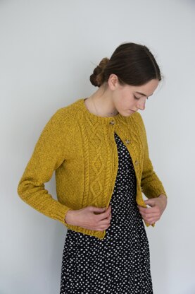 Knitted in Rowan Softyak DK, this neat and pretty cadrdigan features paired plain and twisted cables on the fronts with a textured stitch patterns on the back and sleeves. Hems, cuffs, neck and buttonbands are all ribbed.