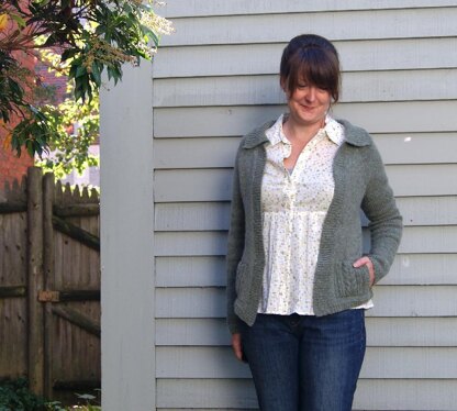 Olivenite is knit from the top down with raglan shaping and increases along each front. Ribbed trims are picked up along each front and a ribbed collar is worked around the neck. Patch pockets with cable details are a pretty and functional added detail.