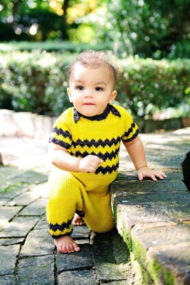 This top-down romper features a onesie style neckline that overlaps on each side providing room to go over baby’s head without a gaping wide neck or button closure. Front and back are worked separately and then joined for the body, then separated again for the legs to make diaper changes easy. The romper features chevron colorwork, which can be just as easily exchanged for stripes or even worked solid to make it more beginner-friendly. Pattern includes instructions for short sleeves & long sleeves, and both shorts & pants options.
