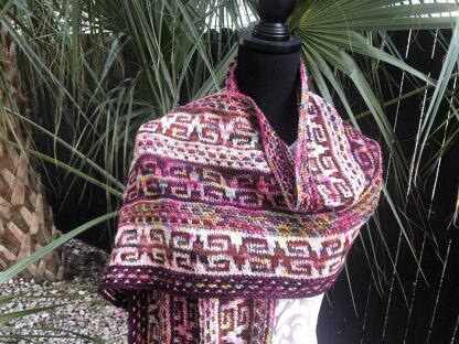" On the Aztec trail " is finished and I am so happy with the way it worked out. Mosaic knitting is one of my new passion, easy and fun to create using variegated hand dyed yarns Koigu Jasmine 100 % merino wool with 242 yards makes this a very soft beautiful wrap I used 4 different colors This wrap is so much fun to knit you will want to make more than one, Koigu Jasmine has a wonderful hand and drape Knit them for your friends, family etc......