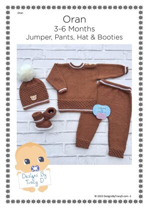 Oran 3-6mths pram set Jumper, pants, hat & booties