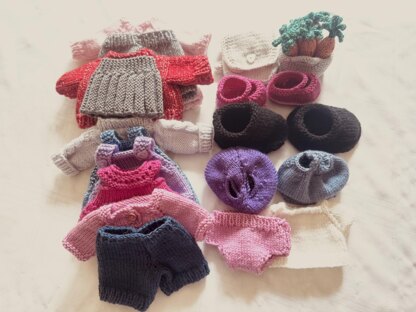 Outfits included on this pattern are: Dungarees; Pinafore Dress; Joggers; Cable Sweater; Dress; Cardigan; Mary Janes; Boy Bunny Shoes; Knickers; Sleepsuit; T Shirt; Boy and Girl School Uniform; Beret; Flat Cap; Rucksack; Carrot Basket; Carrots.