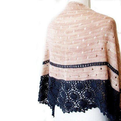Choose two contrasting skeins of your favourite fingering weight yarn. The Oyster Shawl is knit from the top down, forming an elongated crescent shape. Written instructions are provided for the eyelet body section, then choose from charted or written instructions for the circle lace edging.