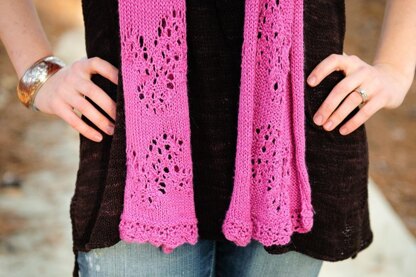 This all-season scarf can fend off the chill or accent a sundress with a contrasting mash of lace. Scarf features 2 panels worked from the hem up with scalloped edges and a floral paisley lace, and a third middle panel of openwork. Design looks great from either side! Paisley design is charted, pattern recommended for an experienced knitter who is ready for a challenge.