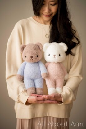 Crochet these adorably cozy teddy bears wearing pajamas! They are perfect for cuddling using a delightfully soft yarn. You will need approximately 3 skeins of "Feels Like Bliss" Yarn (bulky level 5): 2 skeins of the main color (teddy color) and one skein of the contrast color (pajama color) with a 5 mm hook. The colors "Cocoa" and "Sky" were used for the brown teddy with blue pajamas while the colors "Optic White" and "Blush" were used for the white teddy with pink pajamas. Two different body sizes for the bear (Body 1 is the smaller pink pajamas and Body 2 is the larger blue pajamas) are included in the written pattern. Note that this pattern can be found for free (with ads) on my blog!