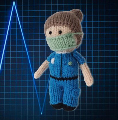 This little Paramedic Doll is dressed in blue scrubs and a protective face mask. Knit a doll as a thank you gift for your nurse, doctor, or medical professional or as a mascot for a medical trainee. This doll has a hair bun, but you could omit that piece to make a doll with short hair. Designed by Amanda Berry @fluffandfuzz, the doll is knitted in acrylic DK yarns on single pointed needles (not in the round). For confident beginners and above, other techniques used include casting on and off, knits, purls, increases and decreases, picking up and knitting stitches, and seaming to finish. The doll is 14cm tall (not including the hair bun).