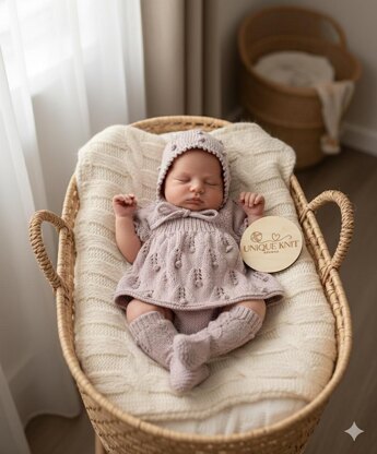 This 4 piece set is ideal for summer. Comprises of the Angel top, Knickers, Bonnet, and long socks. The top is knitted from the top down on straight needles, knitted back and forth, so limited sewing required. The knickers are knitted in one piece from the top front to the top back and sewn down each side. The pretty simple bobble design gives this set a nice modern look.