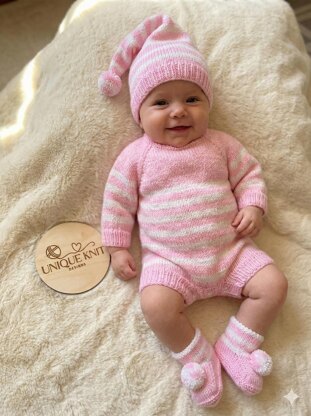 A pretty romper set designed for those new to knitting. This has a simple stripe pattern and is knitted from the top down on straight needles, so it is knitted flat. The Line by line instructions makes this an easy and enjoyable knit. The button bands are included as you go and the instructions tell you where to place the buttonholes, so no complicated calculations to work out. The booties and bobble hat complete the pattern and both knit up quickly.