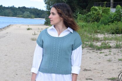 Pearish is a cool slipover to wear alone or layer as the weather transitions. With a simple cable panel running up the center and minimal shaping, it’s the perfect combination of simple to knit and beautifully versatile to wear.