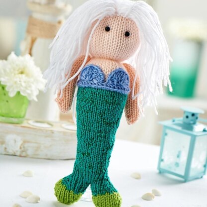 Pearl the Mermaid doll is knitted in stockinette stitch and made from four pieces (body, 2 arms and a bikini) and seamed together. The hair is made from lengths of White yarn that are each knotted onto the top of the head after making up. You could use a smaller needle size and DK yarn with this pattern to make a smaller doll. Designed by Amanda Berry @fluffandfuzz, Pearl is knitted in acrylic aran yarns (worsted/10 ply) on single pointed needles (not in the round). For confident beginners and above, other techniques used include casting on and off, knits, purls, increases and decreases, and seaming to finish.