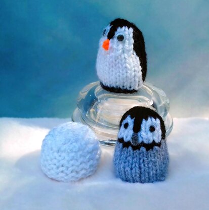 They are knitted in minutes in one easy piece, using straight needles and leftover oddments of DK yarn + toy stuffing / cotton wool for penguin heads.