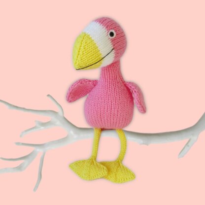 Philippa Flamingo is a bright cheerful bird. Knitted predominantly in stockinette stitch, with increases and decreases for shaping. Designed by Amanda Berry @fluffandfuzz, this toy is knitted in acrylic DK yarns on single pointed needles (not in the round). For confident beginners and above, other techniques used include casting on and off, knits, purls, increases and decreases, and seaming to finish.