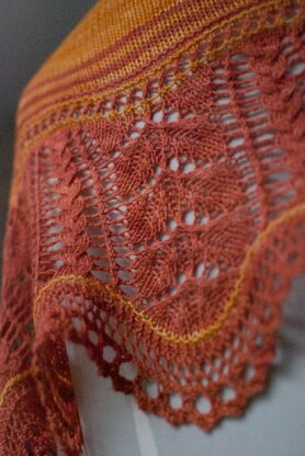 Pippi starts with a narrow lace edging, followed by a border of lace leaves, and cable braids. The body of the shawl is shaped with short rows to create the crescent.