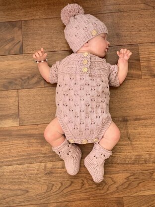 This sweet modern 3-piece Romper design features a textured yoke and an easy eyelet pattern which is then replicated on the hat and booties. The set is knitted from the top down using straight needles and knitted back and forth. meaning very little sewing is required and fewer seams.