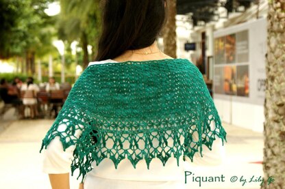 Piquant is a crescent shaped crocheted shawl work in one piece using a single precious skein. This shawl has a very interesting construction. I designed it to avoid long starting chains. This shawl is very easy and quick to do and has a breathtaking result. Instruction come in 2 sizes, small and large, but you can easily adjust the size.