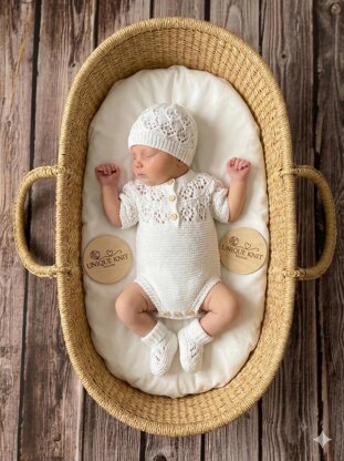 A beautiful 3 piece Romper set knitted with a simple eyelet stitch on the bodice . The romper is knitted from the top down and can be worn with the buttons at the back or front.