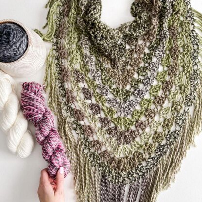 Our Pistachio Wrap is a cozy oversized shawl with beautiful drape and softness. The gorgeous open lace work is created by using a large 15mm hook with bulky weight yarn. Chroma Twist Bulky yarn has stunning colour options available ranging from soft neutrals to vibrant colours. Wear multiple ways and suitable for all seasons. Video tutorial on YouTube.