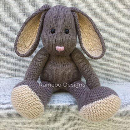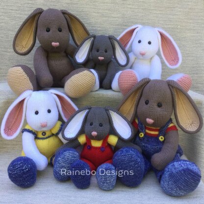 This Plain & Fancy Bunny Family (ITR) is knit in the round, using Magic Loop or double pointed needles. The legs, body, arms and head are all knit on as you work along. The ears are knit flat/seamed and added later. The clothing is not removable. Approx. sizes of 3 bunnies (sitting): (8 ½”, 9 ½”, 11 ½”), and pattern directions for both with and without clothing. They are created using #4-Worsted Wt. (Aran/10-ply) yarn: Sm. Plain Vers (Body-160yds, CC-50yds), Med. Plain Vers (Body-250yds, CC-70yds), Lg. Plain Vers (Body-330yds, CC-80yds), Sm. Fancy Vers (Body-110yds, A-80yds, B-50yds, C-30yds, D-40yds), Med. Fancy Vers (Body-150yds, A-160yds, B-80yds, C-60yds), Lg. Fancy Vers (Body-250yds, A-240yds, B-40yds, C-30yds, D-70yds). Safety Eyes-10.5mm,12mm,14mm. Buttons- 1/2", 5/8"