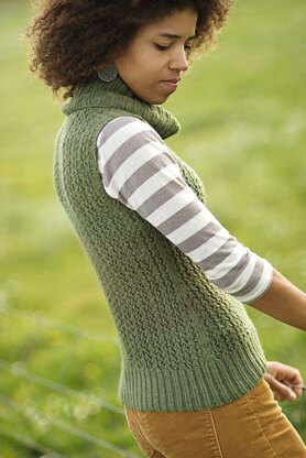 The Bead Stitch panels on this vest form distinctive lines that open up when worn, showcasing a beautiful lace pattern. The twisted stitches of the lace are echoed in the ribbing of the hem, armholes and cowl neck. When worked with the perfect yarn, this garment will be sure to keep your core warm and cosy.