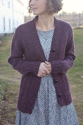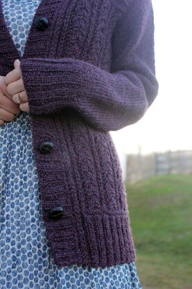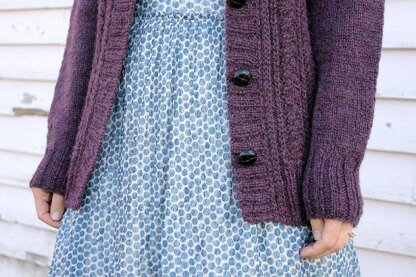 Knit from the bottom up and separated at underarms. Shoulders are seamed, and sleeves are picked up and worked down from underarm, with short row cap shaping. The buttton band is knit last. Cables are both written and charted.