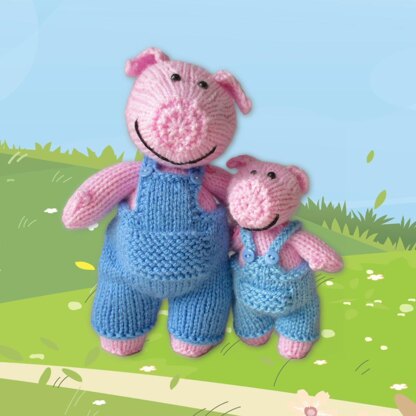 Wave hello to Pop the Pig and their piglet Pip! Both pigs have blue knitted dungarees, and the outfits are removable. Designed by Amanda Berry @fluffandfuzz, the toys are knitted in acrylic DK yarns on single pointed needles (not in the round). For confident beginners and above, other techniques used include casting on and off, knits, purls, increases and decreases, and seaming to finish.