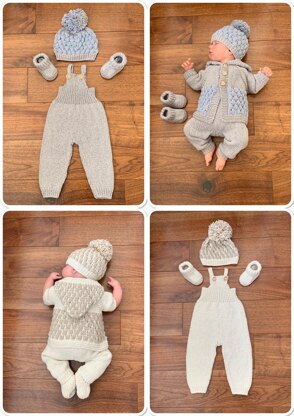 Comprises a Hooded cardigan that can be knitted with either short or long sleeves, this is knitted from the hood downwards. A pair of dungarees knitted from the cuffs upwards. A bobble hat knitted from the brim upwards and a little pair of booties complete the set.