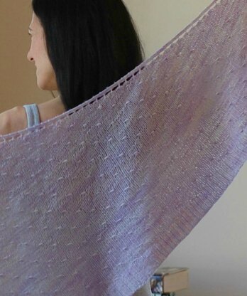 This top-down, half-crescent shaped shawl is dotted with a textured scallop stitch in a pattern that is easy to memorize and easy to wear. Knit up in a merino-silk blend yarn to a loose gauge, the drape is incredible, and the shawl is warm enough to take the chill off a summer evening, but light enough to be worn as a scarf.