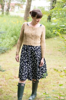 The sample shown was knit with 1" of positive ease in Essence by The Woolen Rabbit. A substitute yarn is shown below.