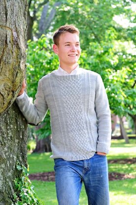This refined aran sweater design is worked in the round from the bottom up with set-in sleeves. It’s perfect for men of all ages. The stitch pattern is surprisingly simple and you’ll delight in watching your progress. Basketweave cabling adorns the front with crossover cable panels on each side and on the back. Sweater shown in size S and finished with leather elbow patches.
