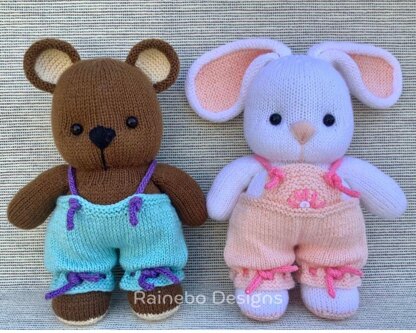 These darling Pudgy Pals are knit in the round, (Intermediate Level), using Magic Loop (or double pointed needles). They are approx. 10 ½” tall (without ears) and are created using #3-light wt. (DK wt.) yarn. The legs, body, arms, and head are all knit on as you work along. The clothes are not removable due to the knotted ankle and shoulder ties. Approx. yardage: BUNNY: Main Color: 240 yds. (Cygnet DK-White 208) Color A: 150 yds. (Cygnet DK-Flash 159) Color B: 30 yds. (Cygnet DK-Pink 65)