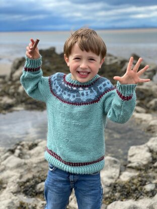 Puffing Billy is the name of the world's oldest steam train, now residing in Wylam, Northumberland. The jumper of the same name is knitted in parts to the armholes and continued in rounds at the yoke where a steam train with nine carriages and a plume of smokes puffs happily round on a track. There are similar tracks at the cuffs and lower edges. I used Willow and Lark Poetry but any DK yarn of the same gauge will work with this pattern which requires 400g - 600g depending on size. Instructions are given for approximate ages 1 to 8 years. If you have any little train enthusiasts in your family, this is the jumper for them.