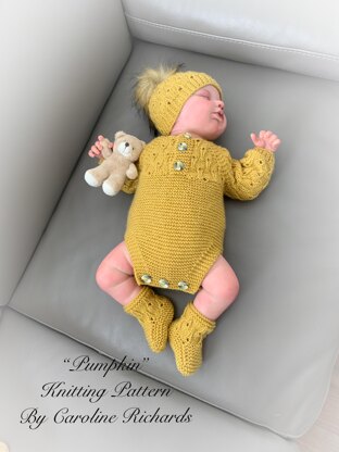 A long sleeved romper pattern with a matching bobble hat and booties. Knitted on straight needles back and forth with line by line instructions. The romper is knitted from the top down, so minimal sewing is needed