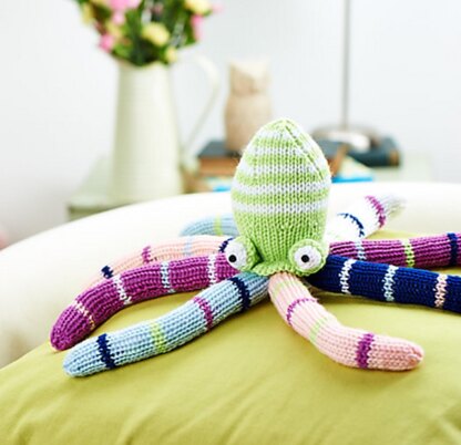 Practice knitting stripes with colourful Quentin the Octopus. Designed by Amanda Berry @fluffandfuzz, this toy is knitted in acrylic DK yarns on single pointed needles (not in the round). For confident beginners and above, other techniques used include casting on and off, knits, purls, increases and decreases, and seaming to finish.