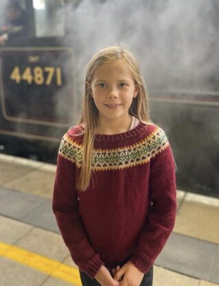 This jumper was inspired by the scenes in Harry Potter films where the students return to Hogwarts by steam train. It has a row of eyelets at the ribs and a surprisingly simple band of colour work around the yoke. It is knitted in parts to the yoke where it is completed on a circular needle. Experienced knitters could easily knit the whole garment in the round to make it seam free. The jumper is knitted in DK wool. I used King Cole Merino Blend for it's anti-tickle properties and the excellent range of colours. Instructions are given for approximate ages 1 to 14 years and include a matching hat.