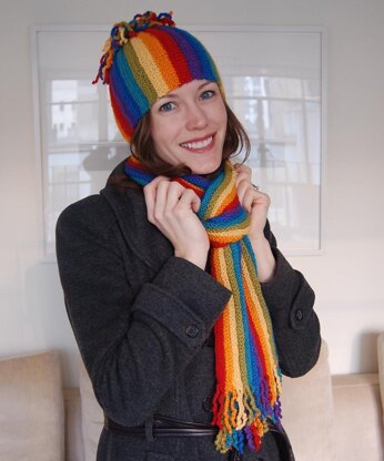 Sideways hat and long scarf set knit in seven colors of sport DK weight yarn. Fringed trim is crocheted. 29" circular needle recommended. Hat is very stretchy, and can fit most folk from 8-year olds through adults. Pattern itself widely available from yarn shop and on-line retailers.