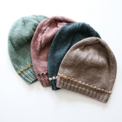 The Rainy Day Hat features a ribbed hem and stockinette body with