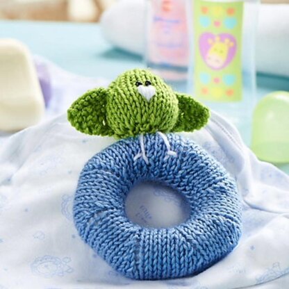 This Rattle Ring is a simple knit, it is knitted flat (not in the round) with increases and decreases to shape the ring. Perched on top of the ring is a little knitted bird. Designed by Amanda Berry @fluffandfuzz, the rattle is knitted in acrylic aran/medium weight yarns. The rattle is 16cm tall. For confident beginners and above, other techniques used include casting on and off, knits, purls, increases and decreases, and seaming to finish.