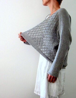 The upper shoulder/back part is worked sideways back and forth in plain Stockinette stitch from a provisional cast-on. Stitches are then joined to knit the first sleeve in the round down to the cuff. Then the second sleeve is worked from the provisional cast-on in the round down to the cuff. After that body stitches are picked up from the long side of the back piece to work the fronts and lower back in Harebell Lace to the final length. I-cord finishing is worked last.