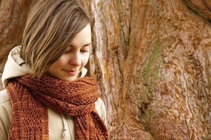Redcedar is a lace stole featuring large scale but simple-to-work lace panels, arranged to resemble the book-matched wood boards of a rough-sawn floor. Worked in a rustic aran weight yarn the piece is a big, bold, oversized stole. Knit in a subtly variegated fingering-weight yarn, the piece is more delicate and refined.