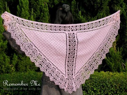 Remember me is a triangular shawl with lace panels on the center and across the top edge. This shawl is crocheted from the neck down and consists of 3-rows repeats to create the body. You can adjust the size very easily according the amount of your yarn. The lacy edging finishes off this shawl nicely. The nice thing you should know about the edging is that you can stop at any row and it will still look pretty. As usual, this pattern comes with row-by-row written direction in US crochet term and charts.