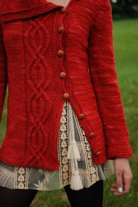 Revere House is a fitted, asymmetrical jacket adorned with a single, bold cable at the center front and a garter stitch cowl that may be worn open or buttoned snugly to keep out the chill. Worked in soft and warm Malabrigo Twist (sample shown in shade Sealing Wax), Revere House will take you from the first chilly days of fall straight though to early spring.