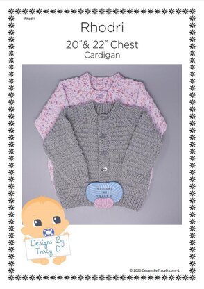 Rhodri is a unisex Baby Knitting Pattern for a beautiful cardigan. It is made using DK yarn with 3.25mm & 4mm needles and will fit a 20" and 22" chest (finished size) 150g of DK yarn required for each size.