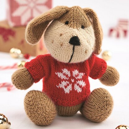 This cute little fellow is wearing his Christmas jumper and is ready for a cuddle. Designed by Amanda Berry @fluffandfuzz, Rhubarb the puppy and sweater are knitted in acrylic DK yarns on single pointed needles (not in the round). The snuggly sweater has a snowflake design worked in stranded colour-work, and a chart is included in the pattern. For confident beginners and above, other techniques used include casting on and off, knits, purls, increases and decreases, and seaming to finish.