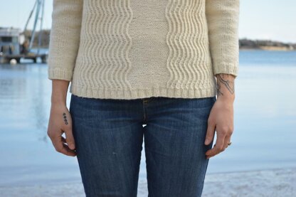 Rippling Sands was inspired by the lines left behind in the sand at low-tide. The stunning twisted stitch pattern creates an overall wavy stitch pattern. This is achieved by using Bavarian twisted stitches. The design is a simple boxy, drop shoulder sweater worked in the round from the bottom up. The top portion is worked separately flat with the shoulders seamed together with a three-needle bind off. Afterward the 3/4 sleeves are picked up and worked outward from the body in stockinette stitch. Knit up in Kelbourne Woolens Scout yarn Ripping Sands is an impressive piece to add to your hand knit wardrobe!