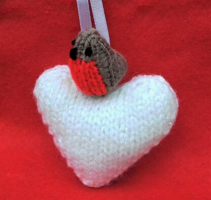 A knitted hanging heart decoration with a perching Robin Redbreast.