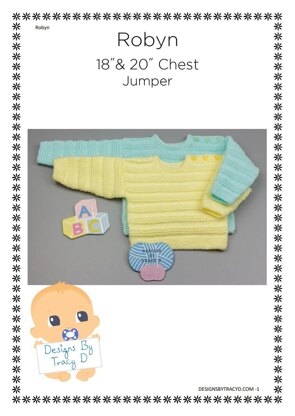Robyn is a Unisex Baby Knitting Pattern for a jumper in 2 sizes to fit a baby 18" & 20" chest made using DK yarn and 4mm needles.
