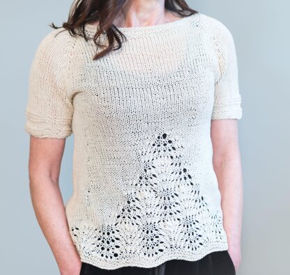I never tire of the Feather and Fan lace pattern, it is one of my favorites! It is used in this A-line tee to decorate the front and bottom border. The sample was made with Anzula Vera, one of my favorite non wool blends that is a silk and linen mix with a lovely drape! Grab your needles for tee time!