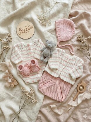 A stunning collection of multi-pieces, suitable for a baby boy or girl. Pattern includes a romper, a cardigan, pants, shoes, and a bonnet