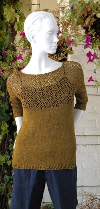 Whether you dress it up or down, this is the perfect top for summer, or dressing up an outfit for holidays at any time of the year. With extended shoulders, the lace pattern drapes over the top of the arms for a feminine touch. Work the body in the round in stockinette with waist shaping for a flattering fit, beginning with a narrow ribbed hem. Before reaching the armholes, begin working the lace pattern at the center of the front only, deceasing stitches each time a new repeat of the lace pattern is added to compensate for the change in gauge.